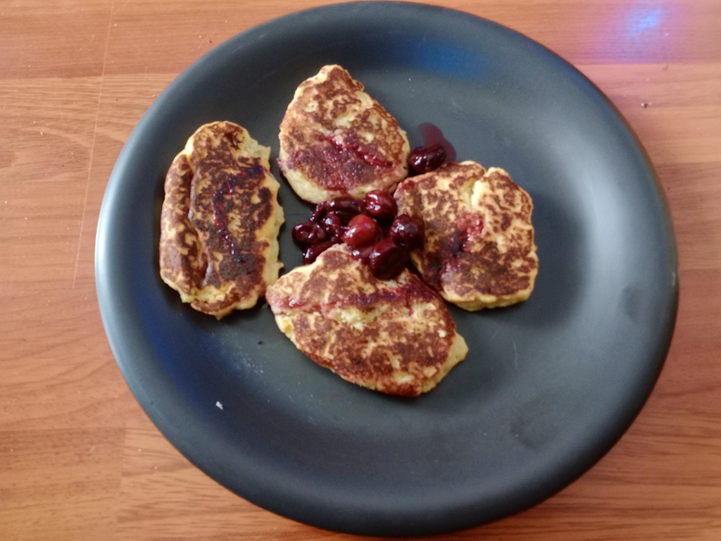 For a sauce, I heated juicy frozen cherries. The cherry juice was drizzled over the pancakes, and the cherries were served on top.