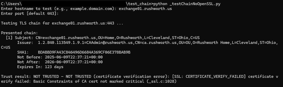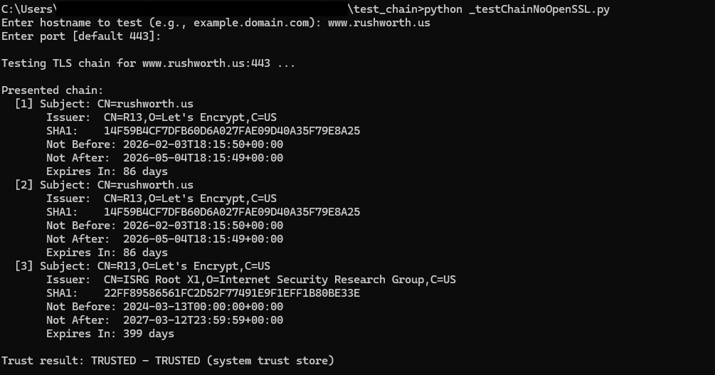 print(f"\nTesting TLS chain for {hostname}:{port} ...")