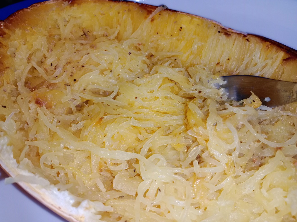 I made spaghetti squash tonight – cut in half (although I’ve since learned to cut it the short way instead of the long way to get longer strands), rubbed with olive oil and salt, set for ten minutes, then roast at 375F for about 50 minutes. Once they were tender, I pulled the strands apart, added a little butter, pepper, and garlic.