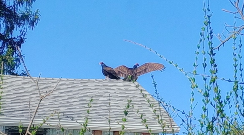 The buzzards used to hang out in this old, dead tree across the street; and, after the rain, they would spread their wings and dry out. The tree fell a while ago; but, now that our roof is stable … we’ve got buzzards airing out their wings on the roof.