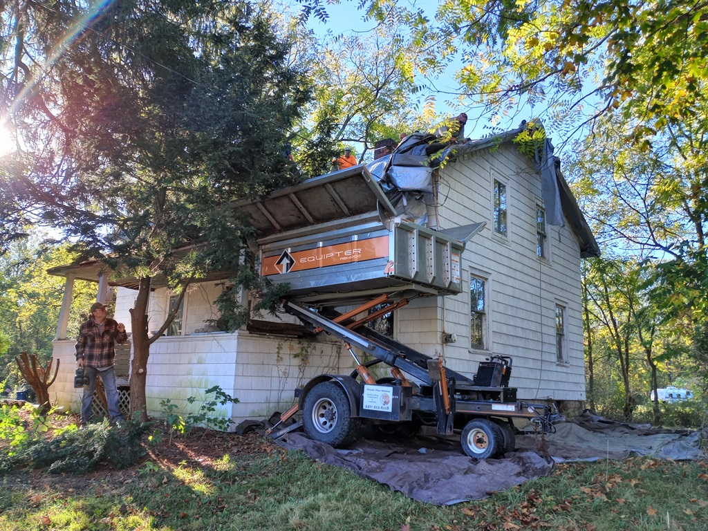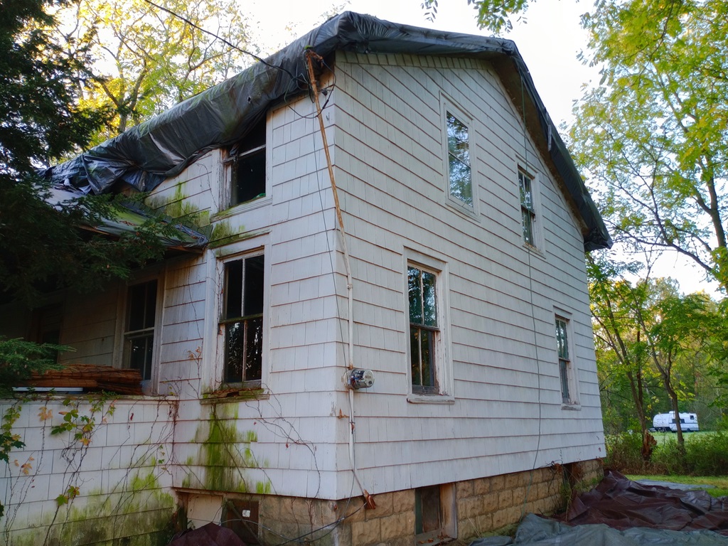 October 1, 2025 Farmhouse Recovery – Roof Edition We removed some massively overgrown yew and arborvitae — before, you could barely see the house through the plants And now, we’ve got a house again They’re starting to pull the tarps off the roof and repair the roofing