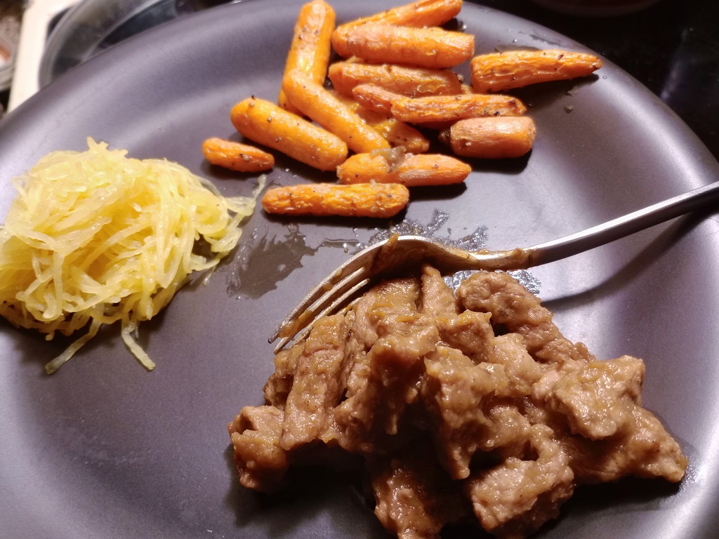 Cubed pork and diced apples sauteed. Oven roast carrots. Spaghetti squash – cut in half (if you cut it the short way, you get longer strands!), rubbed with olive oil and salt, then baked at 400 for 30-40 minutes until tender. Pulled with a fork to form threads.