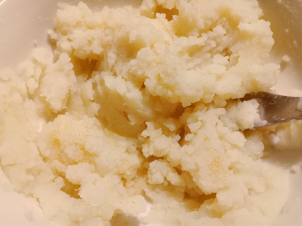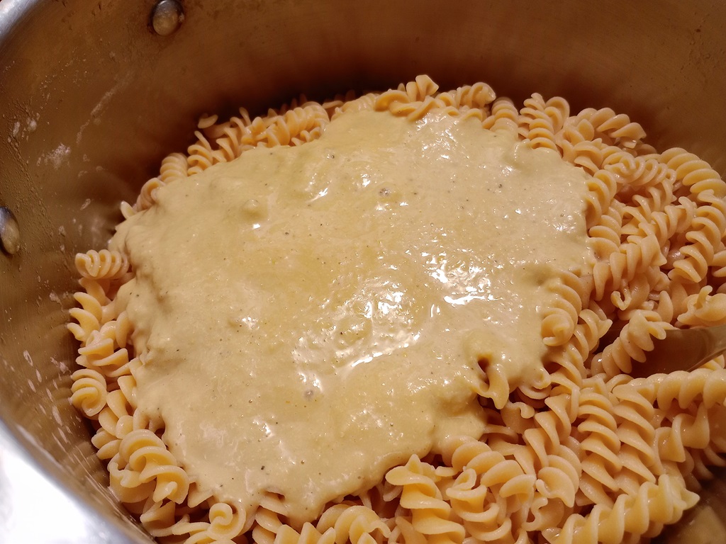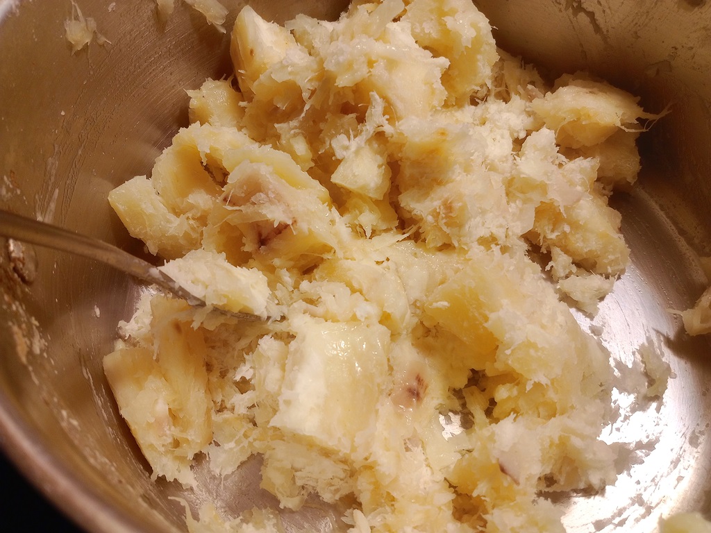 Mix together and add enough vegetable stock to make a dough — it rolled out very nicely, cut into nuggets and smooshed with a fork.