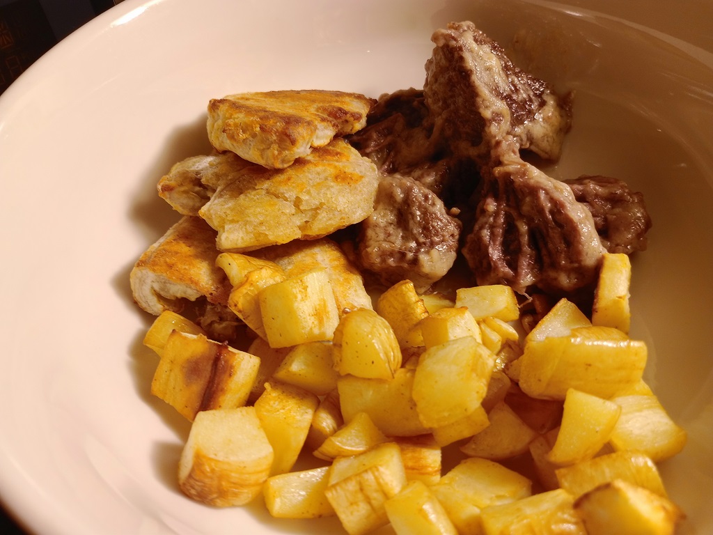 I made braised shortribs and roasted parsnip today. I also made a baked version of tostones. Steam the plantains (cut the ends off, steam or microwave for ~3 minutes per plantain), cut them into rounds, then squish into a flat nugget. Lightly coat with salt and olive oil, then bake at 425. 10 minutes, flip, and ten more minutes. It could use some sort of sauce, but they are very similar to potato nuggets.